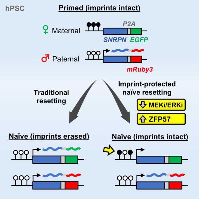 Our study on tracking and mitigating imprint erasure during induction of naive human pluripotency is now online at Stem Cell Reports. In this paper, we tackled a long-standing problem in stem cell biology: the erosion of parent-specific epigenetic marks (so-called “imprints”) during the generation of naive stem cells, which more closely resemble the pre-implantation blastocyst. These imprints are protected during the genome-wide wave of demethylation in the pre-implantation embryo and ensure monoallelic expression of hundreds of genes during human development. However, imprints are demethylated under current conditions for inducing naive human pluripotency, which creates an epigenetic imbalance in naive stem cells and their derivatives. To track the dynamics of imprint erasure during naive resetting in real time, we established a dual-colored fluorescent reporter at both alleles of the imprinted SNRPN locus. During primed-to-naive resetting, SNRPN expression becomes biallelic in most naive cells, and biallelic SNRPN expression is irreversible upon re-priming. We utilized this live-cell reporter to evaluate chemical and genetic strategies to minimize imprint erasure. Decreasing the level of MEK/ERK inhibition or overexpressing the KRAB zinc-finger protein ZFP57 protected a subset of imprints during naive resetting. Combining these two strategies protected imprint levels to a further extent than either strategy alone. This study offers an experimental tool to track and enhance imprint stability during transitions between human pluripotent states in vitro.