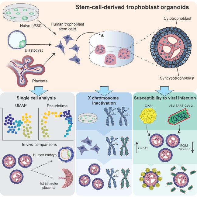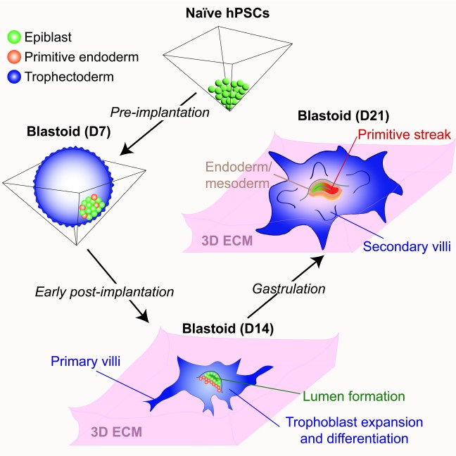 Our paper on extended human blastoid culture was published today in Cell Stem Cell. In a transformative advance, several groups have reported that naive human pluripotent stem cells (hPSCs) can form blastocyst-like structures (also known as “blastoids”) that model the human pre-implantation embryo. However, the extent to which blastoids can recapitulate defining features of post-implantation development remained unexplored. In this study, we optimized the conditions for blastoid generation from naïve hPSCs and investigated their capacity for extended culture on thick 3D extracellular matrices, which better mimic the physical environment of the human endometrium compared to flat surfaces. We developed an experimental methodology that supports human blastoid culture for up to day 21 (D21), including the formation of complex embryonic and placental structures. By performing a detailed single cell transcriptome analysis at three distinct time points (D7, D14, and D21), we benchmarked our model system to human embryos at pre-implantation, early post-implantation, and early gastrulation stages.